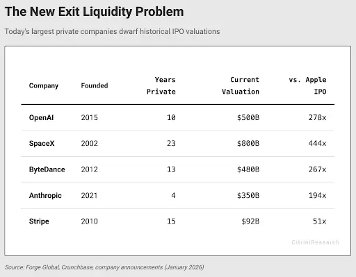 散戶在股票市場獲得高額收益的機會越來越渺茫,究其原因或與企業延遲上市有關。研究機構 Citrini 發文探討了現代資本市場中公司傾向於長時間保持私有狀態的問題,導致增長價值主要被 VC 機構捕獲,公共市場或已淪為流動性退出工具。以下為內容詳情。
