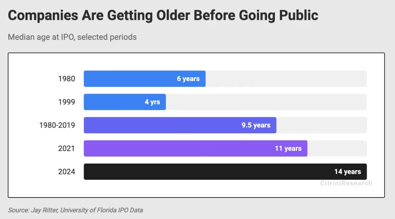 如今,類似蘋果在 70 年代、AOL 在 90 年代初那個階段就上市的公司,幾乎沒有了。