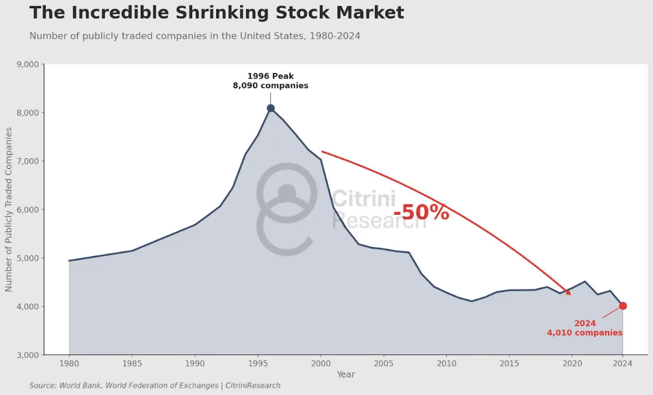 1996 年,美國有超過 8000 家上市公司。儘管如今經濟規模呈指數級增長,但上市公司數量卻不足 4000 家。