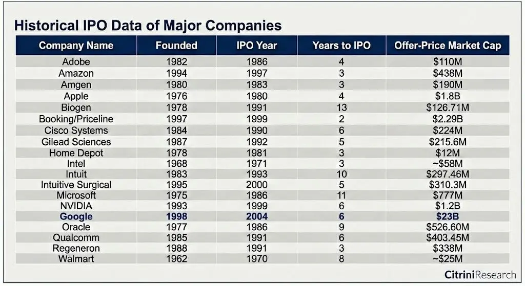 即使是市值最高的 IPO 公司——Google(230 億美元),也只是當時前 100 大公司中的墊底水平。