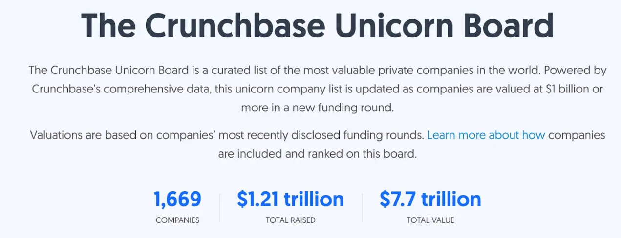 Crunchbase 獨角獸榜單上的企業總價值達 7.7 兆美元,超過了標準普爾 500 指數市值的 10%。