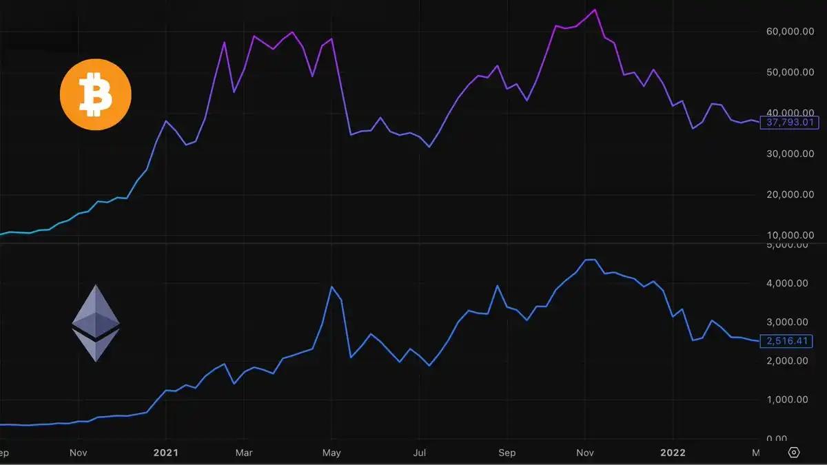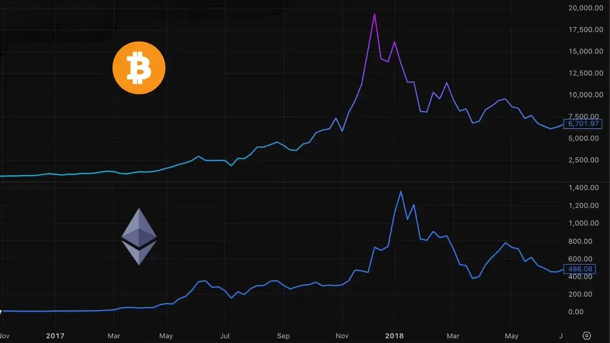 ICO 狂潮時期(2017 年中 - 2018 年中)的 BTC 與 ETH 價格