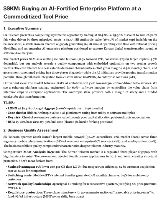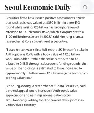 市值約100億美元的SK Telecom(韓國上市,美國ADR代碼:SKM)似乎已向Anthropic的2023年C輪融資投資了1億美元,該輪融資估值約為50億美元。此外,SK Telecom可能還通過其美國風險投資機構SKVTC進行了一筆未公開的額外投資。目前尚難判斷是否存在ARB,但感覺這似乎是獲得Anthropic股份的一種相當合理的途徑。請自行研究。披露:持有Anthropic多頭頭寸 $SKM