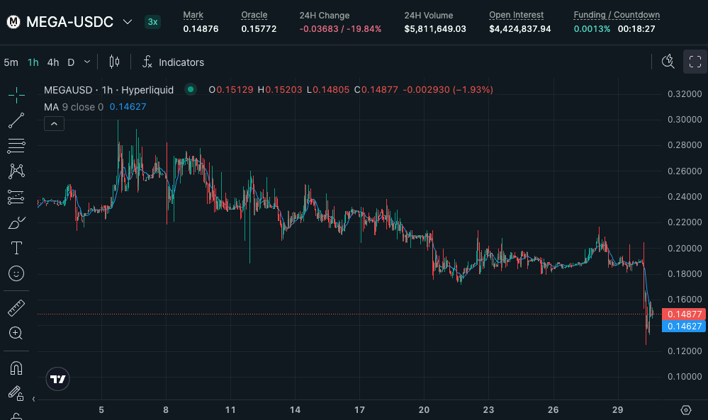 今天,Hyperliquid 交易所的 MEGA 盤前永續衍生性商品暴跌 20%,最低跌至 0.125 美元,即完全稀釋估值 (FDV) 為 12.5 億美元,之後反彈至目前的 0.148 美元。