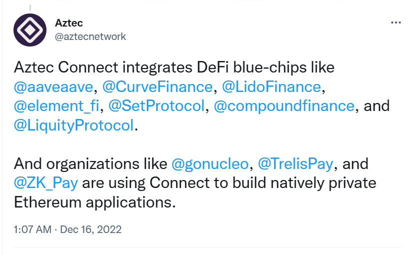Aztec 重點之一 Aztec Connect 在 7 月 7 日正式上線,這是一套連接以太坊 DeFi 協議和 Aztec 的 private rollup 工具,其能夠在三部分(Layer 1 DeFi 協議、Aztec Connect SDK 和 Aztec Connect Bridge 合約)的幫助下支持隱私 DeFi。Aztec Connect 擴展了 Zk.money 的功能,增加了藍籌 DeFi 合作伙伴的功能,它通過與其他 Zk.money 用戶的批量交易來允許隱私訪問以太坊主網上的協議,使以太坊項目較容易可地集成 Aztec。Aztec Connect 像 DeFi 的代理服務,允許任何人存入 Aztec 網絡,與以太坊 DeFi 交互,並依賴於 Layer 1 的可信合約、流動性。當前 Aztec Connect 生態系統包含以太坊主流 DeFi 協議,包括 Aave、Curve、Lido、Compound 和 Liquity 等。