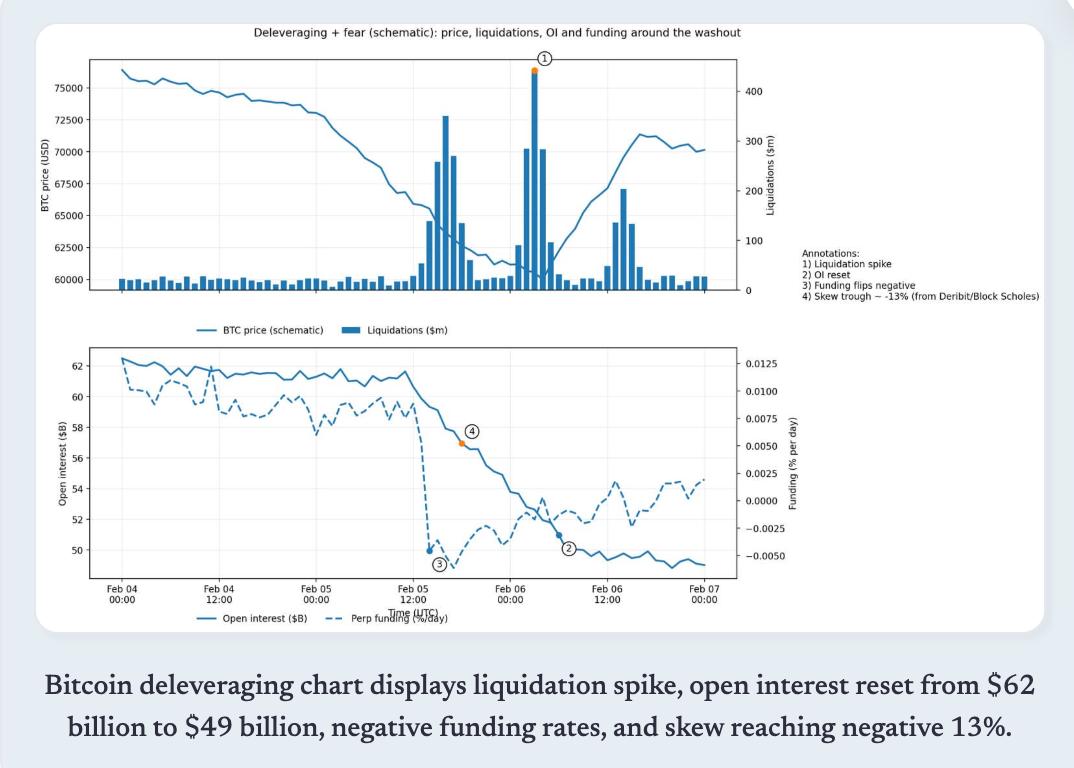 比特幣去槓桿圖表,顯示了清算激增、持倉量從 620 億美元重置至 490 億美元、負資金費率以及偏度觸及 -13%。