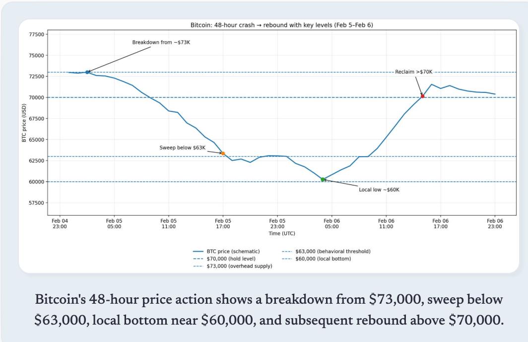 比特幣 48 小時內的價格走勢,顯示了從 73,000 美元的崩盤、跌破 63,000 美元的掃損、60,000 美元附近的局部築底,以及隨後回升至 70,000 美元上方的反彈。