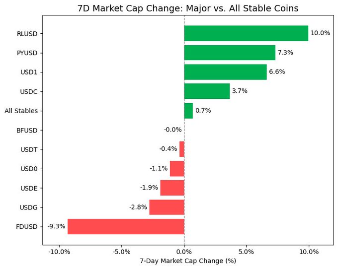 上週,$RLUSD 市值上漲 10% 📈,$PYUSD 市值上漲 7.3% 📈,$USD1 市值上漲 6.6% 📈。$FDUSD 市值下跌 9.3% 📉,幣安下架了多個 FDUSD 現貨交易對。