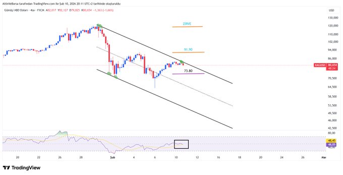 #XAGUSD #白銀 簡而言之,價格仍在下降通道內,這意味著目前的趨勢是向下的。價格接近通道頂部,這是一個明顯的阻力區域。 除非突破 91.90,否則上漲行情將只是回調。80.50 附近是短期支撐區域,73.80 是一個重要的支撐位。RSI 指標也表現不明朗,沒有明顯的強弱之分。 我在我的群組 http:/t.me/finansalkurtulus… 分享我的白銀分析和交易。