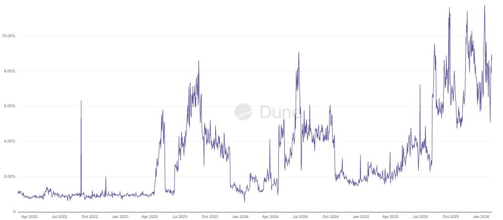 落地到Flashbot Protect的交易百分比,來源: Dune