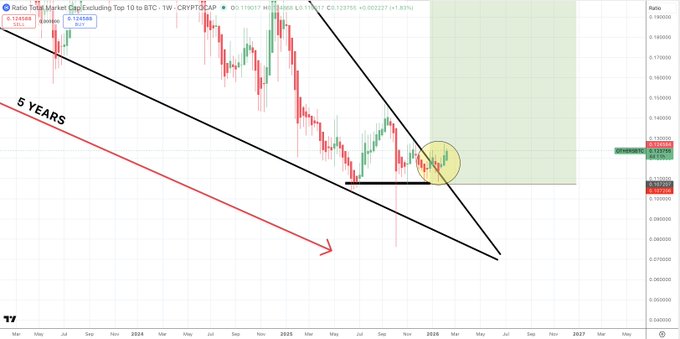 其他/BTC3 天 $OTHERS = (不含前 10 大公司的總市值) 現在完全沒人談論的是,中低市值另類股票在經歷了長達五年(整整五年!)的下跌楔形盤整後,終於迎來了突破。 這太棒了🚀🚀🚀