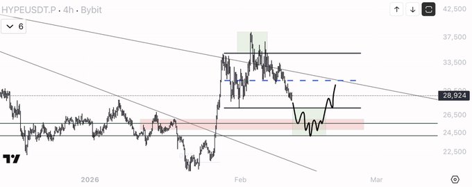 $HYPE 4小時圖顯示,價格在33-35區域下方出現強勁的上漲行情,隨後出現派發。目前價格被壓縮在下降趨勢線下方,動能正在減弱。 24.5-26區域是關鍵的技術區域:一切將在此區域見分曉。如果價格在此區域乾淨利落地反彈,則可能構築底部,為新一輪上漲嘗試創造空間。反之,如果價格最終下跌,局面將徹底改變。 這是一個過渡階段,而非預期階段。唯一重要的是該結構在何處得到確認。