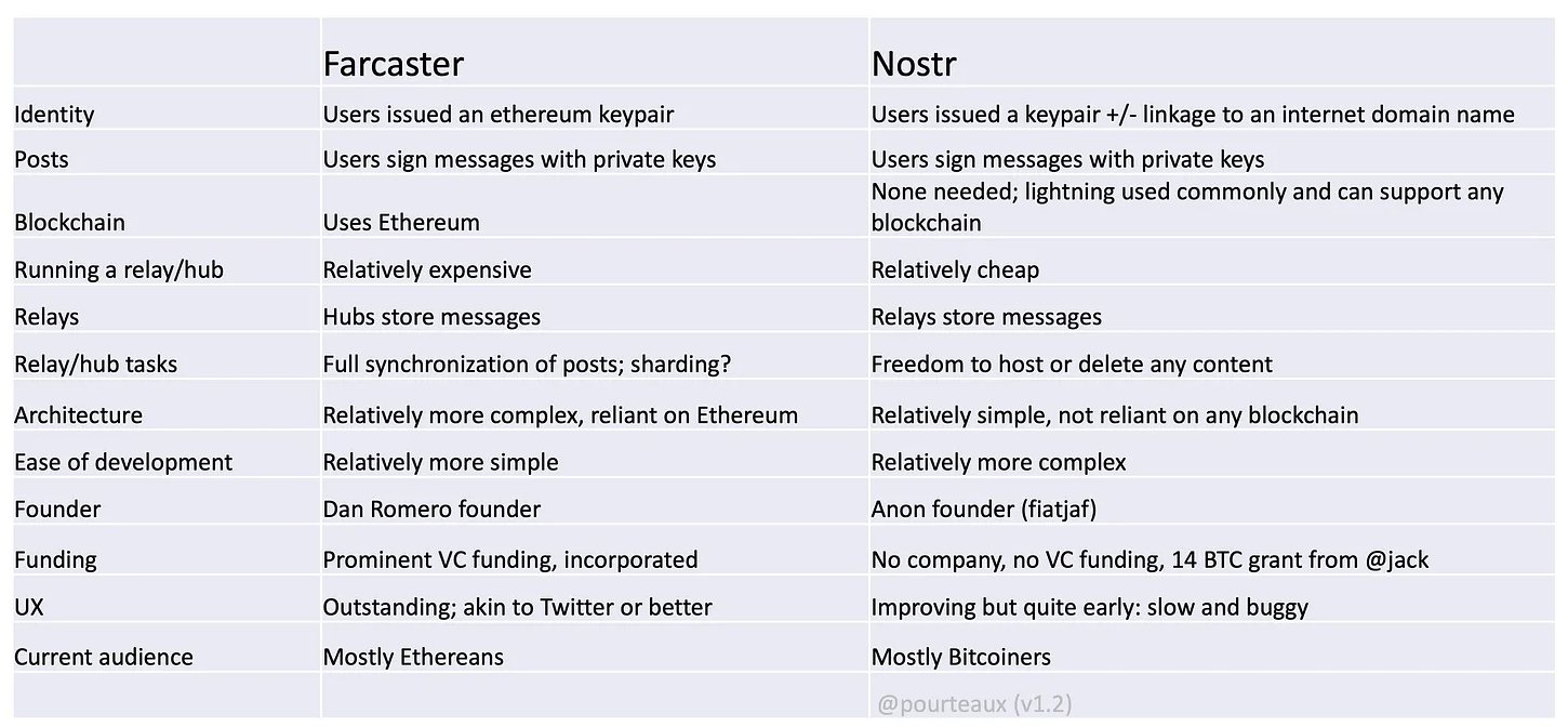 讓我們深入探討 L1 的兩種嘗試:Nostr 和 Farcaster。 我很高興同時使用這兩者,並將提供我對兩者的非技術經驗以及我所看到的潛力和侷限性。 我還要感謝 fiatjaf(建立了 Nostr)幫助我理解了 nostr,感謝 Dan Romero(Farcaster 的創始人)邀請我加入 Farcaster。 我還要感謝 Maciek Laskus,他對每一個問題都進行了透徹的分析,並就該主題與我進行了交談。 讓我們從一張表開始: