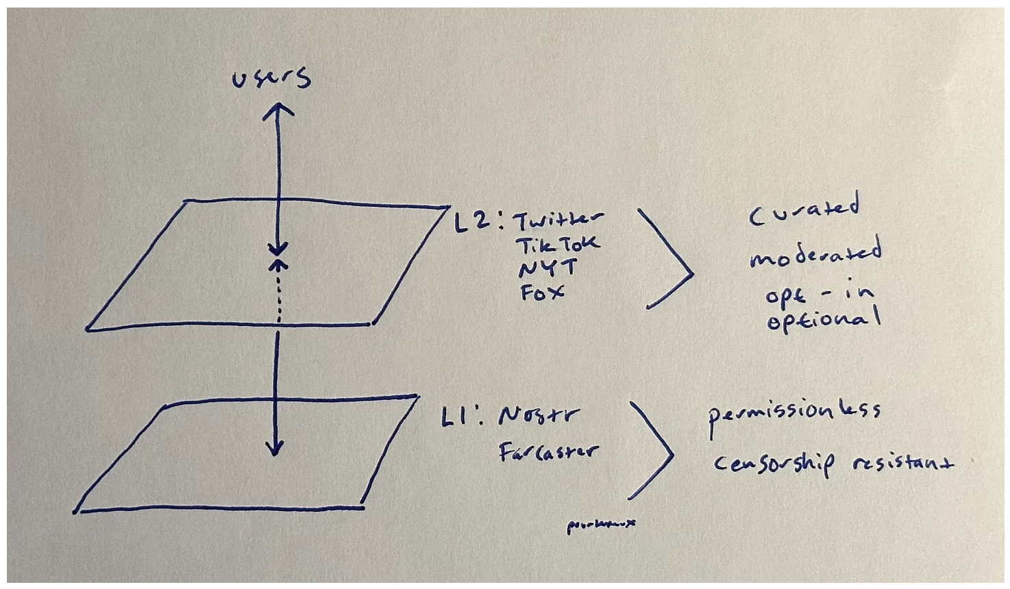 像 Nostr 或 Farcaster 這樣的協議可以是無需許可和抗審查的,因為在一個分佈式網絡中,沒有人可以向其發送刪除請求。當然,這是一個尚未完善的的解決方案,因為如果你停在這裡,那麼你得到的只有一個分佈式的 4chan ,這基本沒有人會感興趣。你需要一個第二層的私盈公司和客戶來充當策展人和版主。用戶可以選擇加入併為這個管理層付費,以提供更好的體驗。根據你的世界觀,你可以從《紐約時報》或 《Joe Rogan Experience》 的第 2 層策展付費。Twitter 本身可能是來自 Nostr 或 Farcaster(或兩者)的內容策展人,並在內容旁邊為你提供廣告以使平臺免費。所有這些不同的 L2 運營商的審核決策可能會有一些重疊,但也會有很多不重疊的審核決策。因此,沒有人有被“去平臺化”的風險,除非你完成了同時被所有不同的 L2 管理者禁止的不可能的任務。即便如此,對於那些能夠忍受的人來說,這樣一個人的帖子仍然可以在未經審核的 L1 上看到。