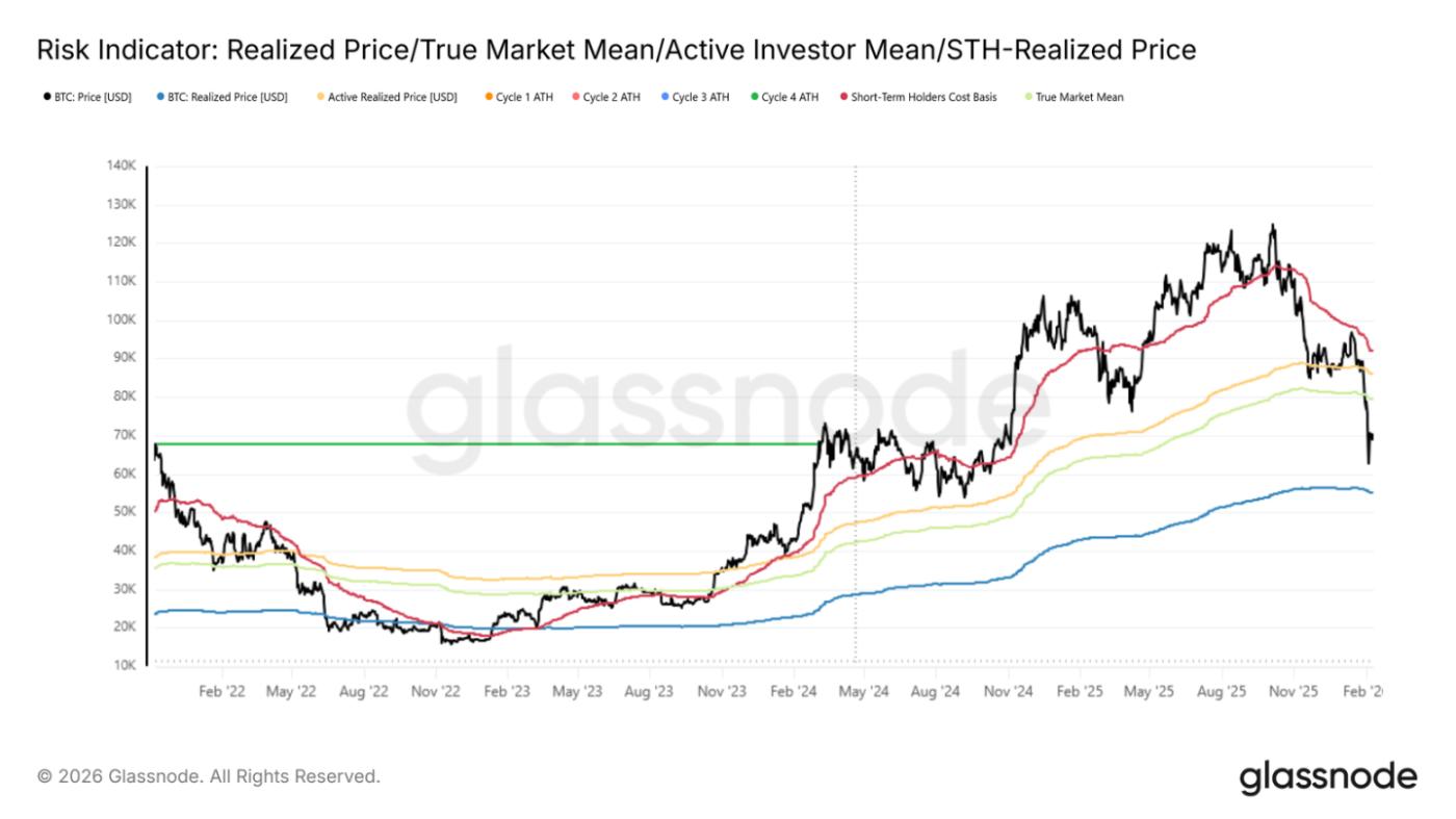 去年 10 月創下新高之後,比特幣經歷了三個階段:先是急跌,反覆測試真實市場均值;然後橫盤到今年 1 月底;最近是第三階段——跌破真實市場均值,加速往 6 萬美元走。