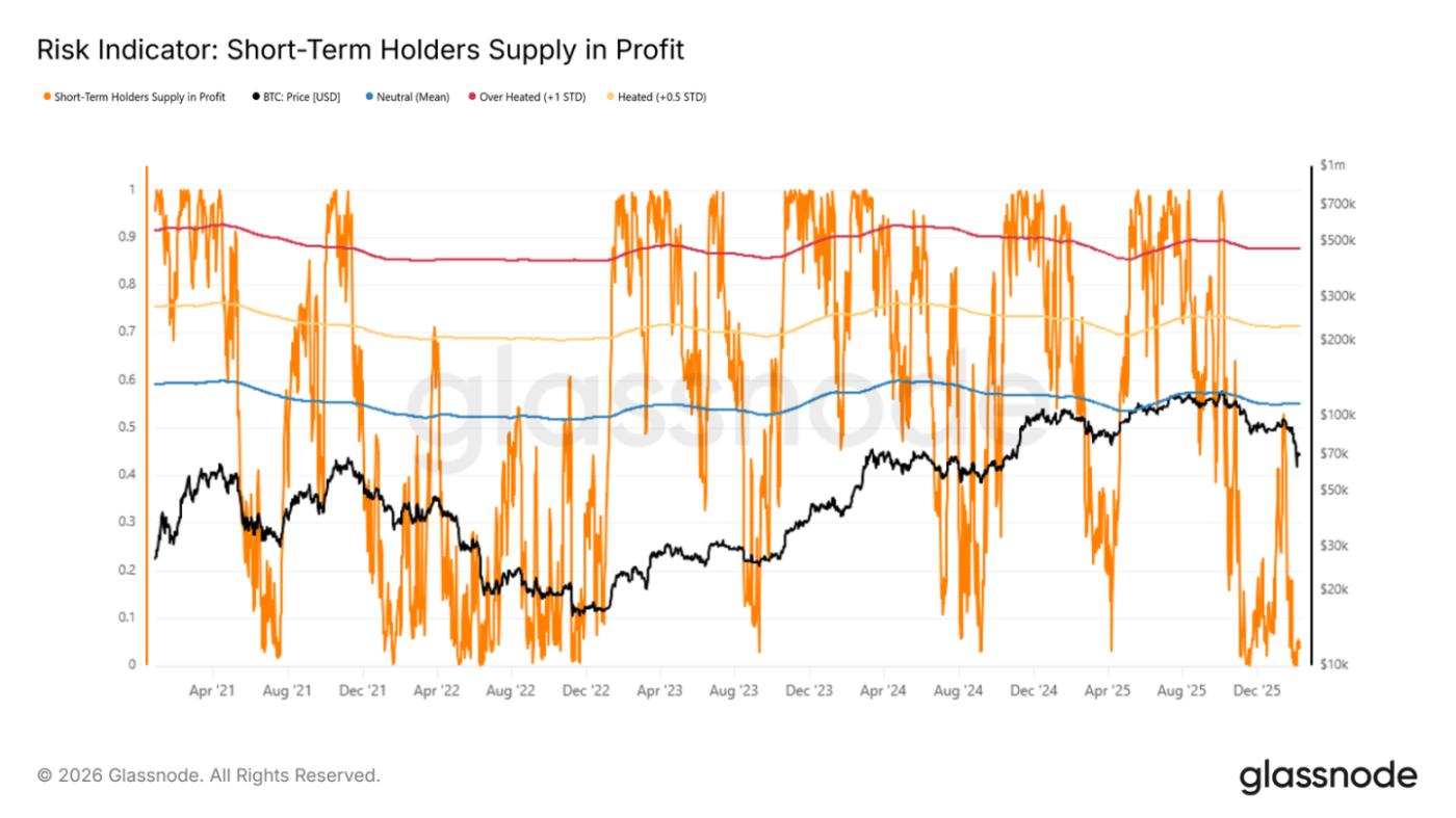 短期持有者盈利比例這個指標很適合看這個。歷史上熊市反彈走到這個指標的「均值到 +0.5 倍標準差」區間時,經常就漲不動了。現在這個數字只有 4.9%,說明絕大多數最近進場的人還套著。盈利的人都很少,想靠他們砸盤也難,但也說明市場很弱,沒有新錢進來,反彈很難走遠。