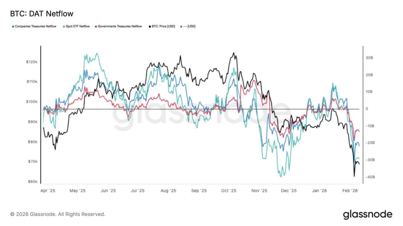 數字資產資金流最近轉負得非常明顯,ETF、企業、政府幾類機構同時在淨流出,比特幣也打到了新低。ETF 是主力,企業和政府也在減,這不是某一家在調倉,是整個市場的機構都在收縮。