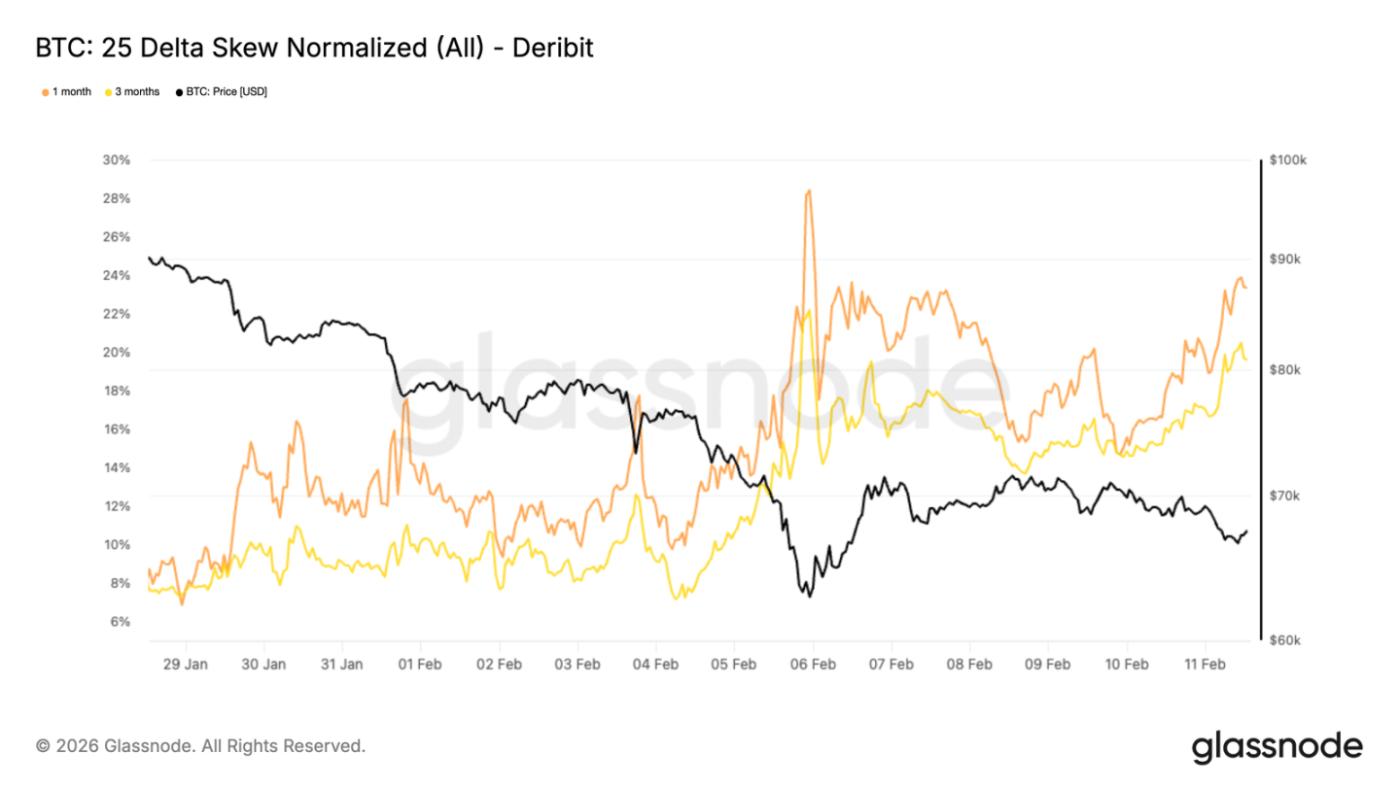 整體波動率上臺階,但錢往哪邊流,要看偏斜度。1 個月和 3 個月的 25 delta 偏斜度,在跌的那幾天直線跳水,全是買 put 的。
