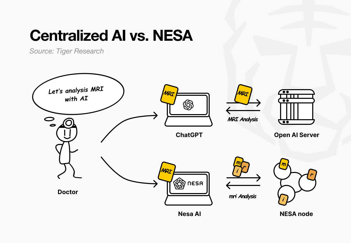 想象一下,一家醫院正在使用NESA(美國國家航空航天局)的技術。一位醫生希望人工智能分析患者的核磁共振圖像,以查找腫瘤。而目前的人工智能服務會將圖像直接發送到OpenAI或谷歌的服務器。