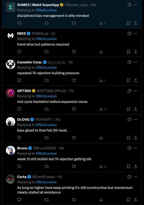 Bob Loukas 🗽本文為機器翻譯展示原文股市第12週,正處於週期中期。 目前仍看漲,並持有部位,因為主要趨勢依然存在。只要2月5日的低點沒有被突破,就應該繼續看漲。 但對7000美元關卡屢次突破失敗感到擔憂。突破時間越長,形成圓頂的可能性就越大。這坡度像癌症一樣蔓延。 (如果群裡有人類,請見諒。)來自推特免責聲明:以上內容僅為作者觀點,不代表Followin的任何立場,不構成與Followin相關的任何投資建議。喜歡收藏 評論分享相關推薦ODAILY黃金一度跌超4%、白銀暴跌11%,美股大跌引爆算法交易貴金屬賣盤?PANewsMeme退潮,敘事趨冷:失守80美元,Solana的週期紅利結束了?BNB2.17%All-in stationCoinbase報告的財報表現平平,導致其股價下挫。BTC0.79%