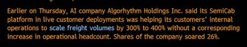 這家公司名為 Algorythm International。 它是一家位於佛羅裡達州的尖端人工智慧公司,其下一代貨運人工智慧系統即將獲得專利批准,該系統在軍事和民用領域具有巨大的應用潛力。