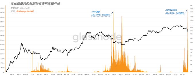 好了,這下攤牌了! 本輪週期 LTH-RPRL(長期持有者已實現盈虧比)首次低於1,上次出現該情況還是在2022年5月9日;LTH-SOPR 也同時低於1,說明LTH不僅已整體上虧錢,而且還在持續的虧損賣出。 (圖1) 然而,對還沒有賣出的LTH來說,此刻BTC每變動一個單位,對他們的心理挑戰也越來越大——也就是長期持有者對價格的敏感度(圖3)—— 目前的高度已經和2014.11.29、2018.11.3、2022.5.25 一致。 (圖2) 經歷過這段歷史的老韭菜們應該能記得,曾經在這些關鍵時間點之後都發生過什麼。對!就是某個事件加重恐慌,讓LTH情緒崩潰;這也是每一輪熊市的最後一哆嗦。 (圖3) 在這個階段,通常市場的情緒表現就是“無視利好,放大利空”。就像現在,我們可以明顯的感覺到BTC正在逐漸與宏觀利好脫敏,似乎是被某一種神秘的力量給綁架了。 這種力量不是某個人、某家機構或某個狗莊所能主導的,而是市場全部參與者絕大部分的共識,簡單來說就是共識出了問題! 我們可以回看歷史,但凡LTH-RPRL掉到1以下,BTC後續開啟深熊模式的概率就會變得極高。注意,這裡說的“深熊”並非是指跌幅深,而是持續時間長。正所謂“傷筋動骨一百天”。 (圖4) 好吧,現在你們都知道:熊市的最後一哆嗦其實就是LTH的極度恐慌爆發點。那問題來了,判斷依據是什麼?我的答案是看“實體調整後的長期持有者已實現虧損(EA-LTH RL)”,規模越大LTH就越恐慌。 從圖4可以看到,在2月5日BTC跌至6w美元時,EA-LTH RL為6.8億美元,已經超過了上輪熊市LUNA暴雷引發的恐慌盤規模。那這算不算是“最後一哆嗦”呢?我不知道;但當下一次出現更低的價格,而EA-LTH RL反而減少了,我就就知道了。 那如果沒有下一次呢?沒關係,只要LTH-RPRL還沒回到1以上,機會有的是。