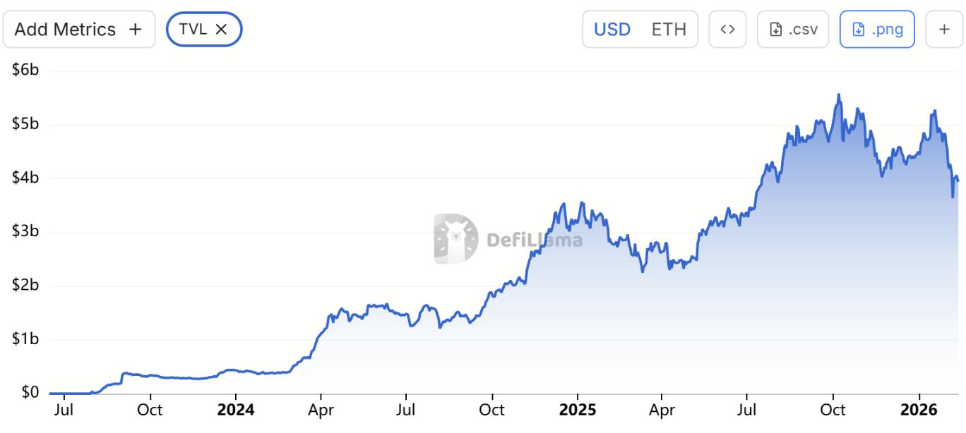 另一崛起的競爭對手 Base 也在飛速成長,尤其以 AI 代幣吸引不少用戶。據 DefiLlama 數據顯示,目前其 TVL 仍維持在 40 億美元的高位。
