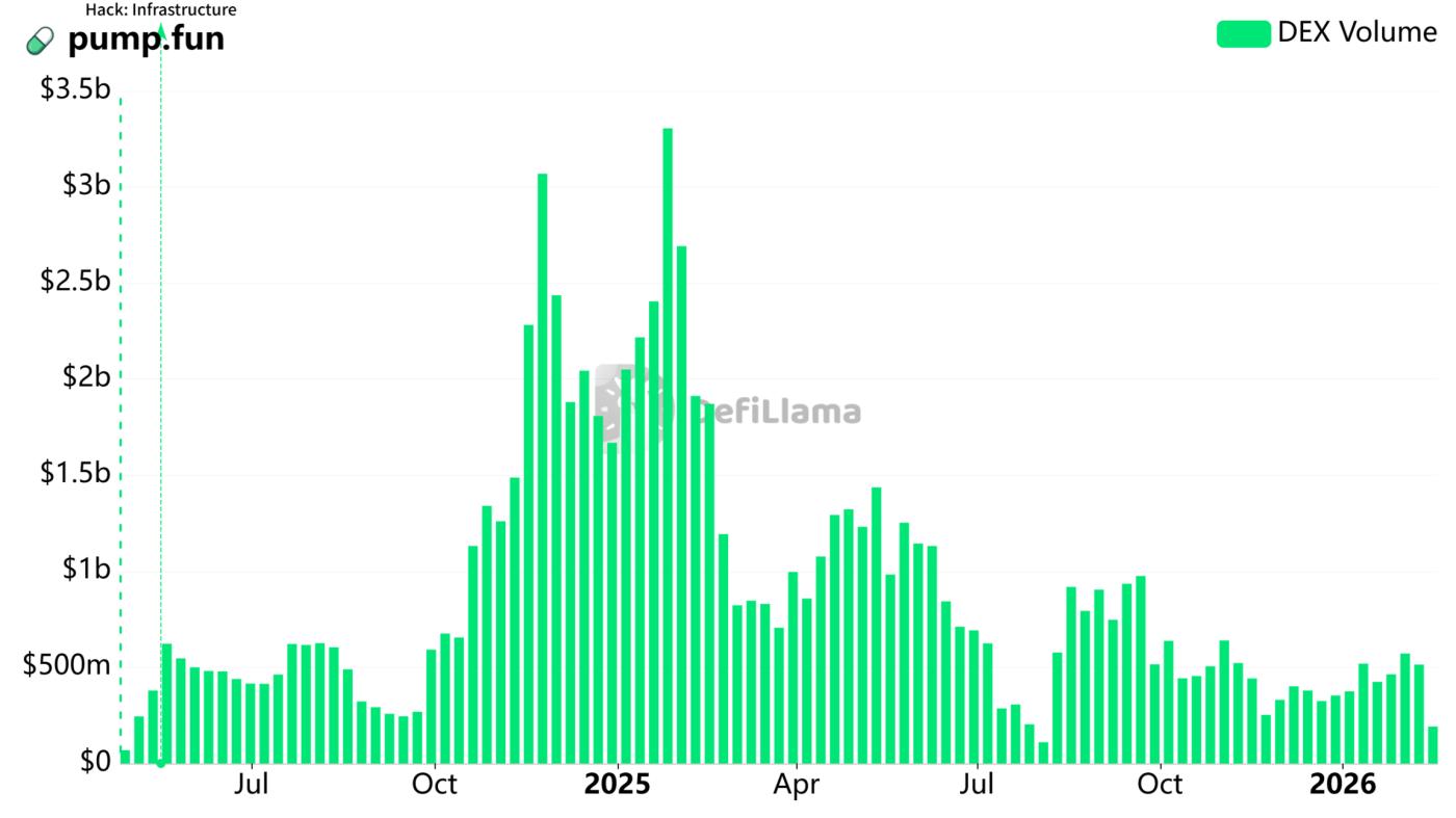 Defilama 數據顯示,Meme 平臺 pump.fun 在 2025 年前後數月,其交易額達到了歷史新高。周交易量兩次超過 30 億美元,隨後便是一路下滑,2026 年年初其交易額均在 5 億美元附近徘徊,是其巔峰的 1/6。