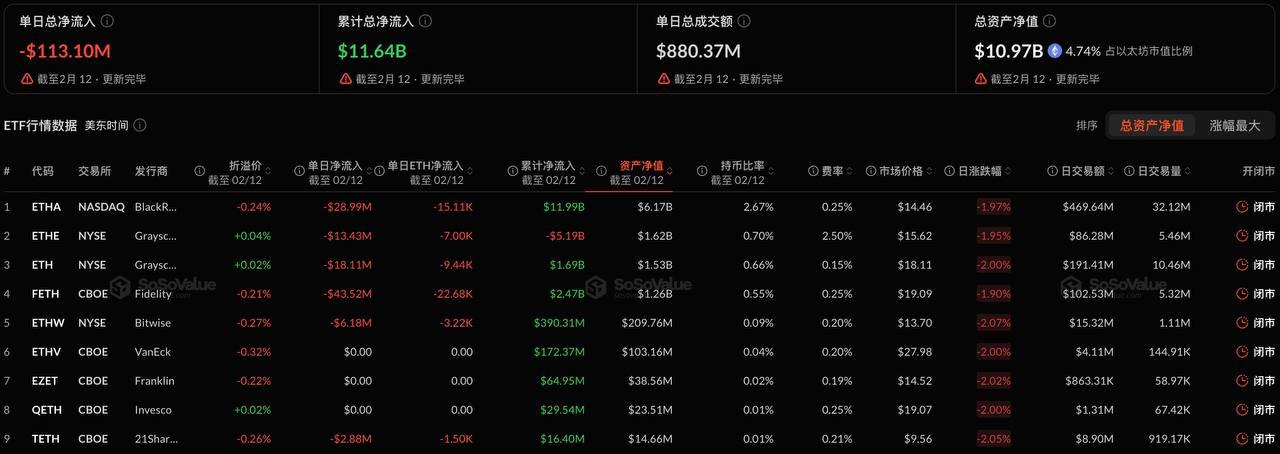 ME News 消息,2 月 13 日(UTC+8),根據 SoSoValue 數據,昨日(美東時間 2 月 12 日)以太坊現貨 ETF 總淨流出 1.13 億美元。
