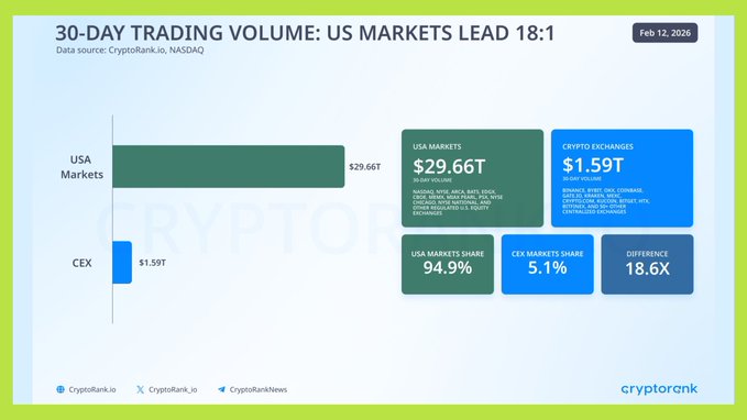 📊 加密加密與傳統金融流動性的流動性缺口 目前,加密的交易量僅佔傳統金融市場的約 5.1%。 換句話說,如果傳統金融是海洋,那麼加密就只是河流的一條小支流。😁 這不難理解。傳統市場擁有數十年的基礎設施建設、清晰的法律框架、養老基金、投資銀行的參與以及大規模的機構資本流動。因此,其流動性更加充裕穩定。 但加密並非只是傳統金融的“迷你版”。 加密交易所全天候運營,結算近乎瞬時完成,全球訪問便捷。而最重要的是:可編程性、無需許可的訪問以及可組合性——這些特性是傳統市場難以複製的。 如果股票市場10%的資金流向加密,加密的日交易量可能會上漲3.5次。 目前的差距相當大。但有時候,正是這種差距才是故事中最精彩的部分。 我們面對的是一個規模太小的市場……還是一個擴展空間巨大的市場? 來源:@CryptoRank_io
