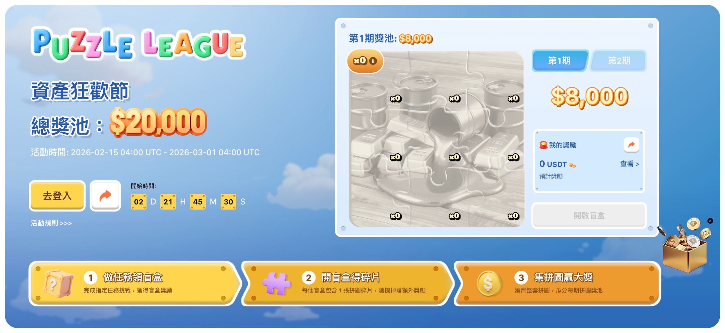 本次「Puzzle League 資產狂歡節」的總獎池設定為 20,000 USDT,活動週期從 2026 年 2 月 15 日持續至 3 月 1 日。活動核心玩法分為兩期進行,每期均設有 8,000 USDT 的專屬獎金池。用戶只需在活動期間內集齊 9 張不同的拼圖碎片,系統將自動合成一套完整拼圖,持有完整拼圖的用戶即可參與瓜分當期獎金池。