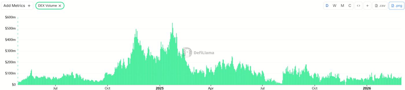 來自 DefiLlama 數據顯示,2025 年 1 月即是 Pump.fun 成交額的高光時刻,此後開始大幅下滑,活躍度陡然下降。2025 年 1 月,單日最高成交額能達到 5.5 億美元,如今則在單日 6000 萬美元附近徘徊。