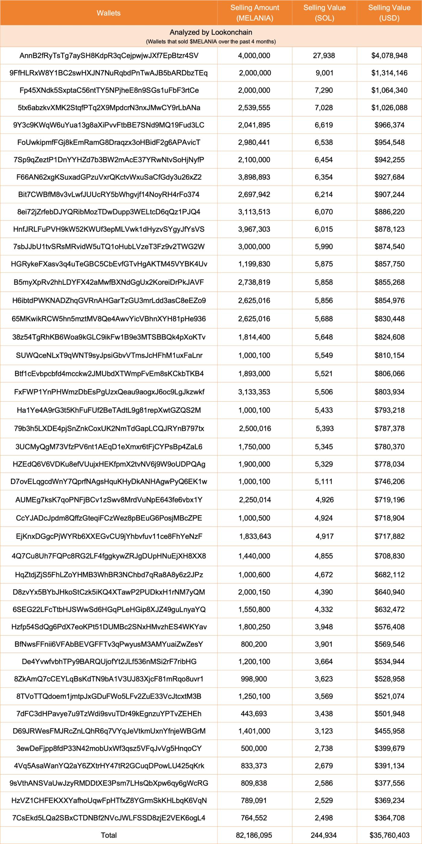 緊隨其後,第一夫人梅拉尼婭也發行了自己的代幣「MELANIA」,代幣上線首日市值突破百億美元,但隨後因內幕拋售迅速崩盤,市值縮水至不足 20 億美元。2025 年 6 月,據 Lookonchain 監測,特朗普夫人官方 Meme 幣 MELANIA 團隊在過去 4 個月中,通過 44 個錢包累計拋售了 82.18 萬枚 MELANIA(佔總供應量的 8.22%),總計套現 244,934 枚 SOL(約合 3576 萬美元)。