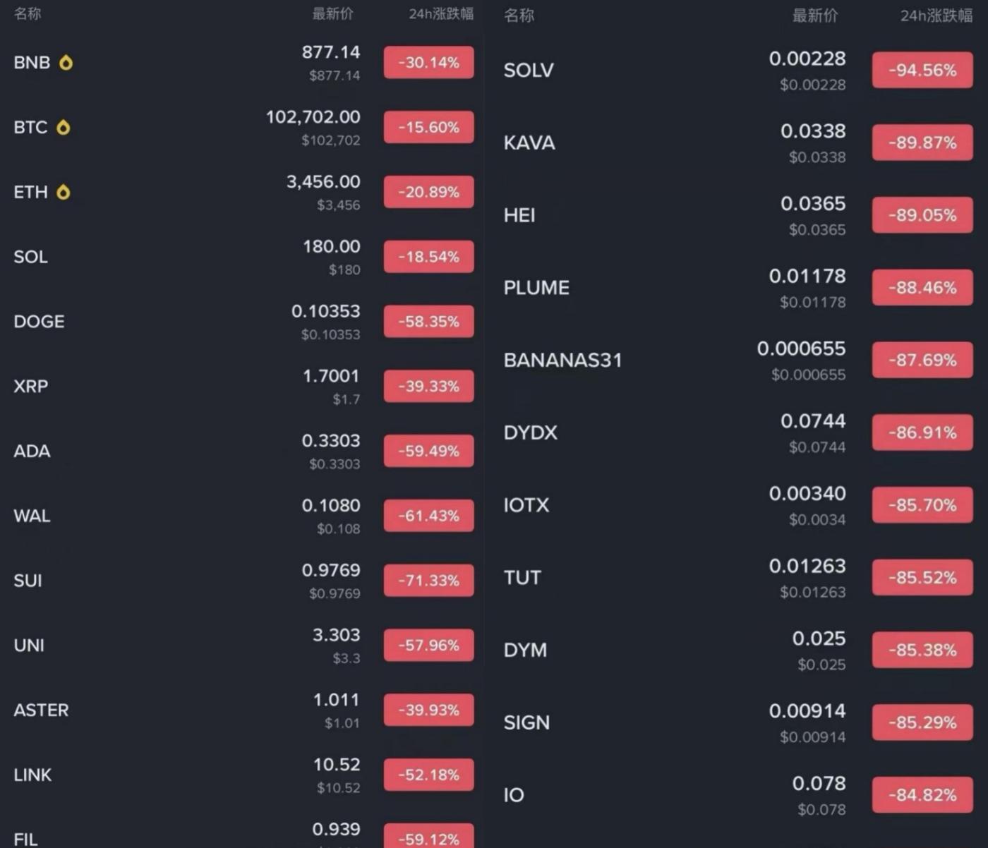 10 月 10 日晚間時候,BTC 不斷下跌,自 12 萬美元一路下滑,10 月 11 日凌晨 4 時許,市場風雲突變,BTC 突然下跌至 11.3 萬美元,隨後不久下探至 102000 美元。BTC 影響之下,ETH 也隨之一度下探至 3435 美元,SOL 一度下探至 168.79 美元,SUI 甚至一度插針至 0.5597 美元,幣安交易所上 ATOM 更是跌至 0.001 美元。鏈上 Gas 也一度飆升至 450 Gwei。Backpack 因行情波動出現故障,交易所 kraken 一度無法訪問。