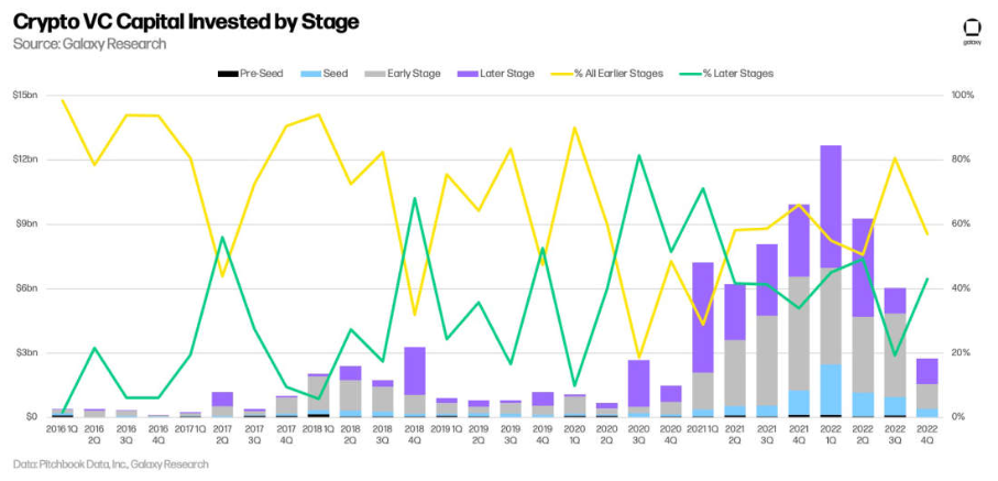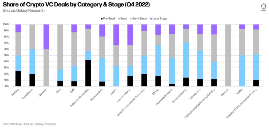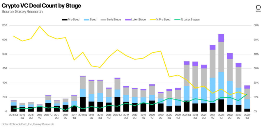 - 种子前的投资交易连续多年下滑。2022 年第四季度,后期投资交易数量首次超过种子前交易数量,这种趋势凸显了加密行业的成熟,但也预示着未来新公司会越来越少,新产品也会越来越少。
