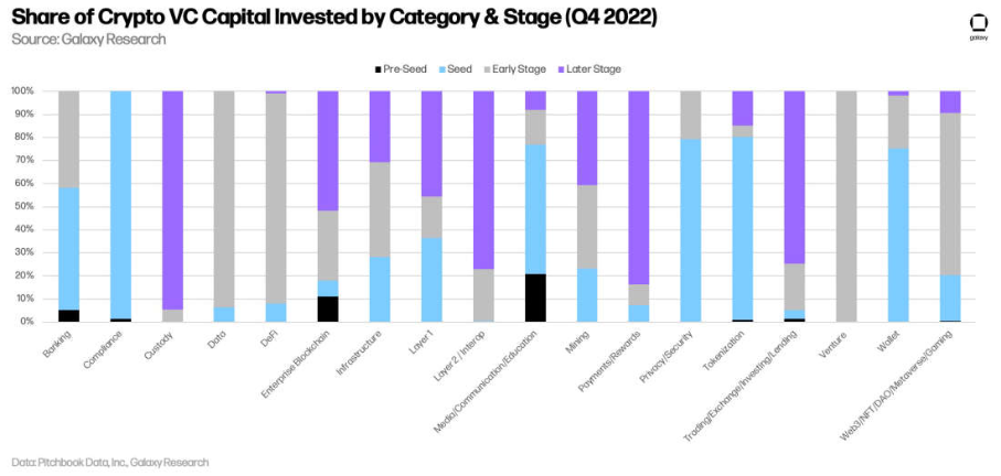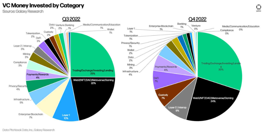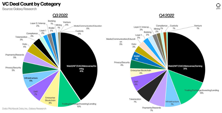 - 发生在 Web3 领域的投资占据了大多数,而与“交易”相关投资金额占比更高。Web3 领域的融资继续引领着 VC 投资,占到 2022 年第四季度所有完成交易的 30% 以上,大量早期公司正在 Web3 领域进行构建,特别是在 NFT 子领域。此外,为交易、投资构建平台与工具的公司继续在融资金额方面占据主导地位,这表明市场基础设施在加密生态系统中的重要性和日益成熟。