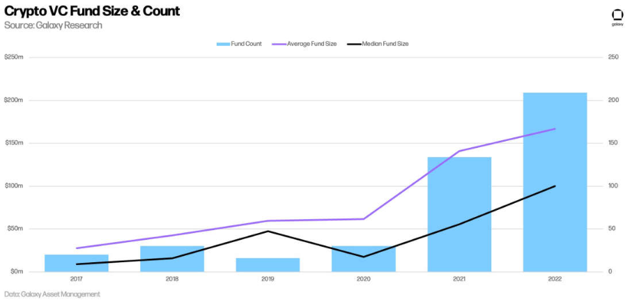 纵观整个VC市场,2022年市场募集超过200只基金,平均每支基金规模超过1.6亿美元。2022 年上半年活跃的 VC 筹款市场是由2021年的加密叙事来推动的,几只突出的大型基金筹款推高了最终的总额,例如 a16z、Hivemind、Ribbit Capital 和 Haun Ventures 等在2022年都推出了各自规模庞大的投资基金。
