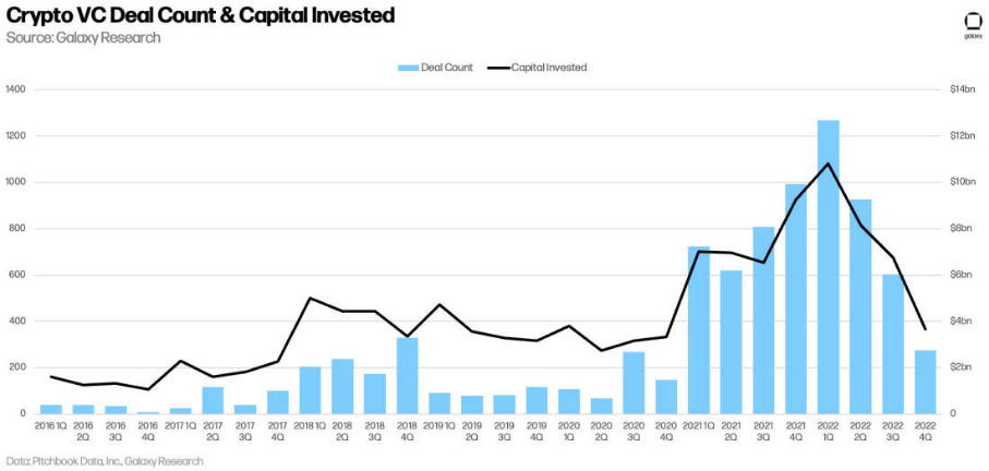 2022 年第一季度,加密 VC 行业创下了 130 亿美元投资金额和 1100 笔交易的历史新高,之后伴随着美元利率的上升、宏观经济环境的恶化以及资本市场的动荡,投资者对加密货币领域的投资兴趣大幅减少,Crypto VC 交易数量和投资金额也开始持续下滑,加密 VC 市场在2022 年第四季度的表现甚至不足2018的同期水平。