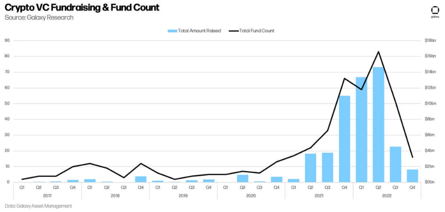 在当前的宏观环境下,因为投资者对投资风险的重新考量或是直接撤资,导致投资机构筹集资金变得很困难,特别是伴随着加密资产价格的下跌和市场的大动荡,进一步加剧了这种困难,2022年Q4季度,无论是加密 VC 基金的数量还是加密基金筹款总额都创下了近两年来的新低。