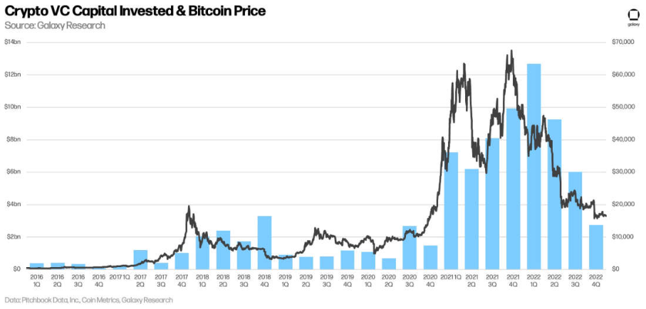 风险投资的发展趋势继续跟随比特币的价格表现,比特币价格在 2022 年第四季度创下近年的低点,VC投资也在第四季度创下低点。