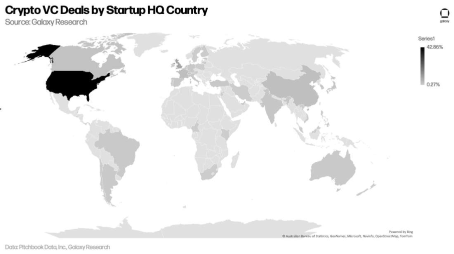 美国继续主导 Crypto VC 市场,超过 40% 的投资交易都流向位于美国的初创公司。