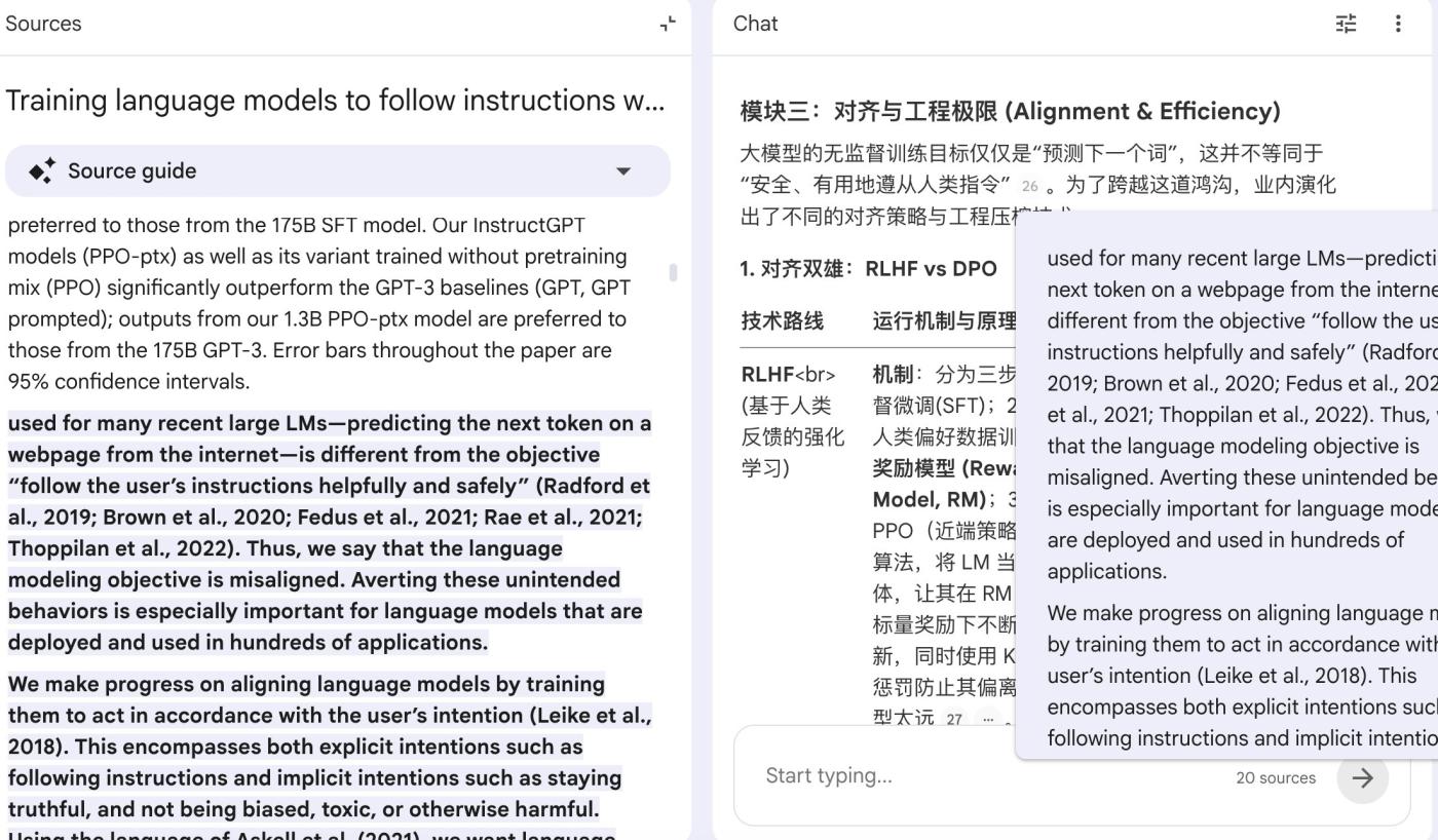 你可以先在Notebooklm問一點比較簡單、直覺的問題,然後將你的理解與其他的AI討論和探討,然後之後再把結論發給notebooklm,讓它去反駁、論證、補充和糾正。
