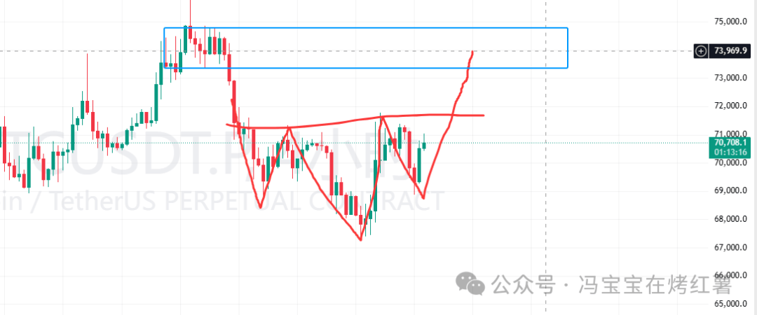 比特幣短線碰到壓力位就被砸下去了,最低跌到6.9萬以下,後又拉回。走勢上走出了個頭肩底形態,小級別回踩已經確認了右肩低點,所以暫時不做空了。