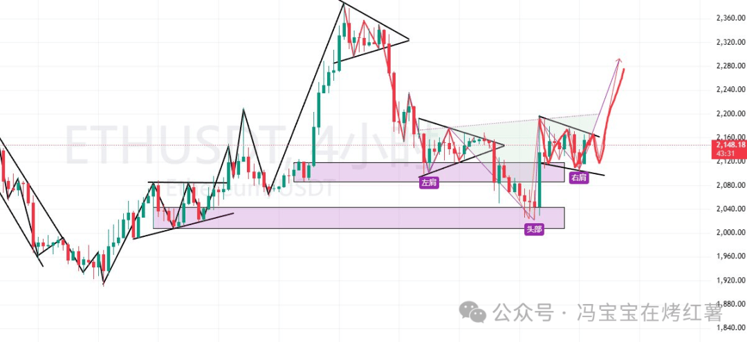 以太坊短線也有反彈需求,形態上是個頭肩底,小級別還走出了看漲矩形,右肩已經走完。只要不跌破2100,頭肩底基本就成立,一旦成型,反彈至少能到前期高點。