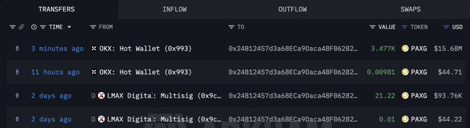 Whale 0x24B1 just withdrew 3,477 $PAXG($15.68M) from #OKX.