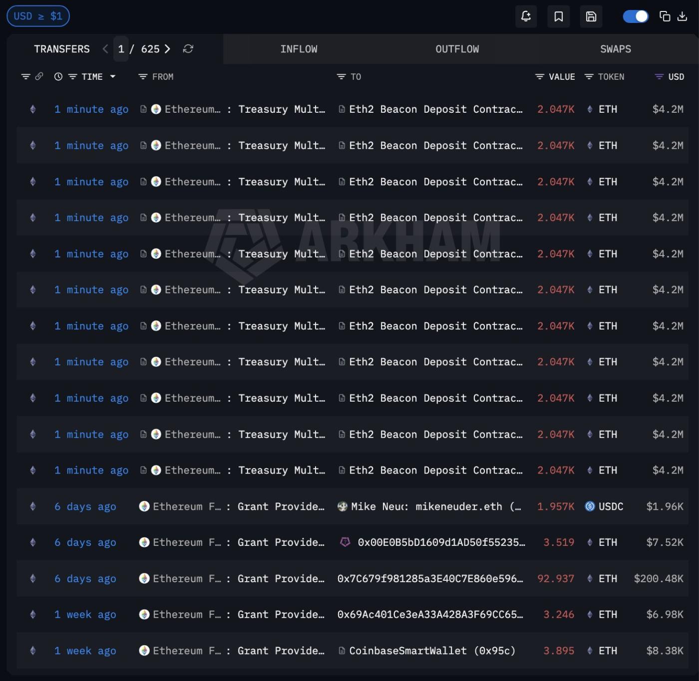 以太坊基金會正在上漲將其儲備資產投入運營的步伐。Arkham的數據顯示,該組織週一stake了超過 20,000 個姨太 ,擴展了驗證者的數量,儘管收益率徘徊在 3% 以下, 姨太價格在 2,045鎂左右交易。