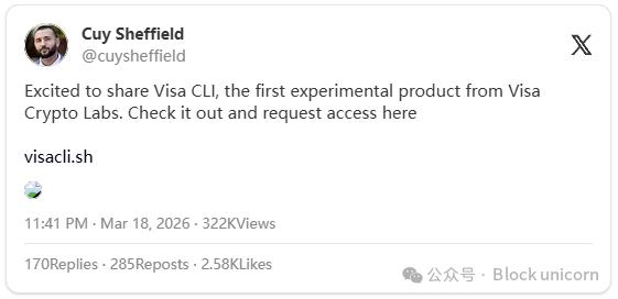 在 Tempo 上線的同一天,Visa 的加密貨幣部門推出了一款命令行界面工具,供人工智能代理通過終端進行支付,無需 API 密鑰、無需賬戶,也無需人工授權。Visa 將其稱為“命令行商務”——機器無需人工干預即可進行交易。