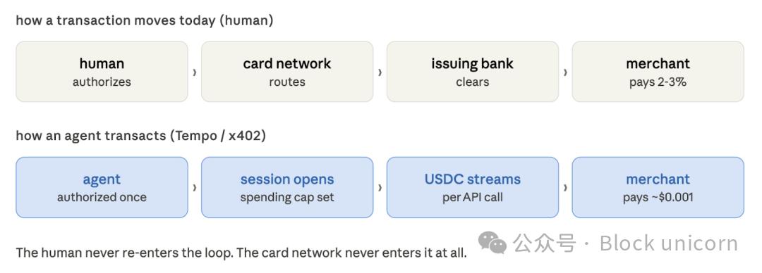 完成研究任務的代理每次會話都會調用數百次專門的數據 API。每次調用成本僅為幾分之一美分。一週下來,這些調用可能為運營該服務的開發者帶來 40 美元的收入。信用卡網絡無法應對這種情況。最低交易額的經濟模式行不通。商戶入駐流程行不通。費用結構行不通。這類商業模式註定無法在 Visa 的框架下運行。它需要一種全新的模式,而 x402、Nanopayments 和 Tempo 正在構建這種模式。