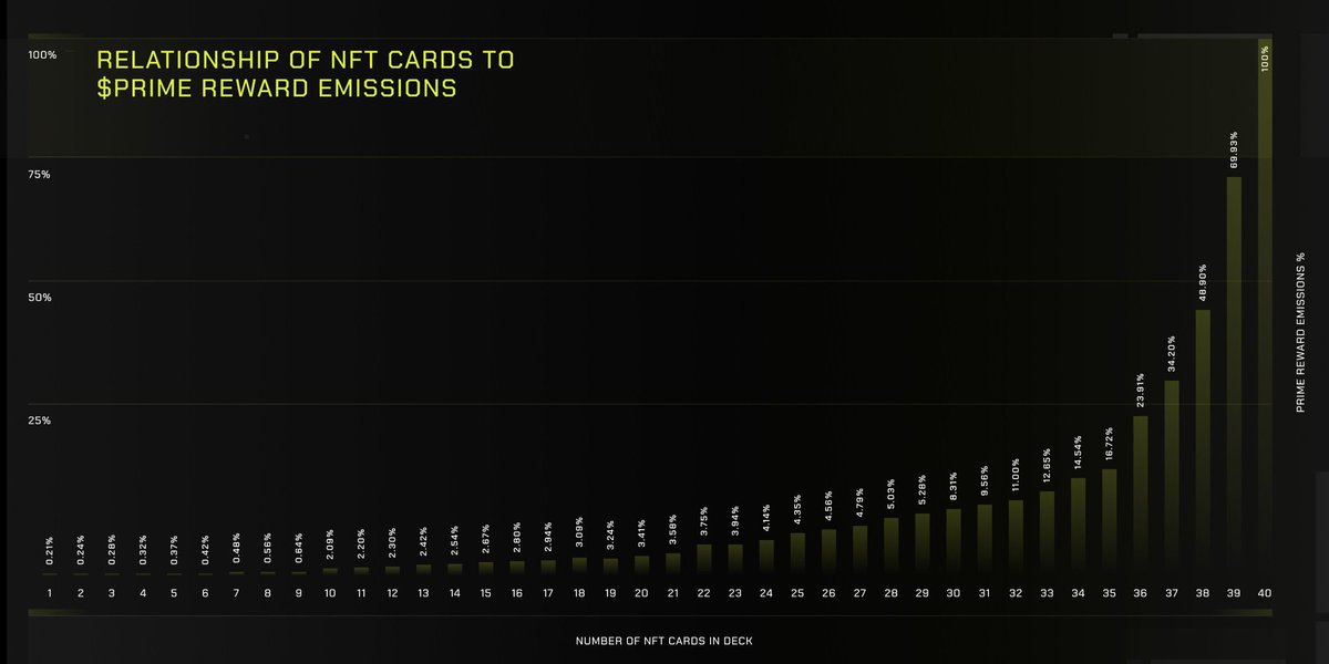 而面向更高階的 Web3 遊戲玩家,Parallel 採用的是 win-to-earn (W2E)機制,這意味著持有 NFT 卡並在競技比賽中獲勝的玩家才能獲得 Prime 代幣獎勵,並且每個賬戶每天的獎勵次數存在限制,而在一副卡組(40 張)當中,NFT 卡的數量越多,獲勝贏得的獎勵也就越完整。