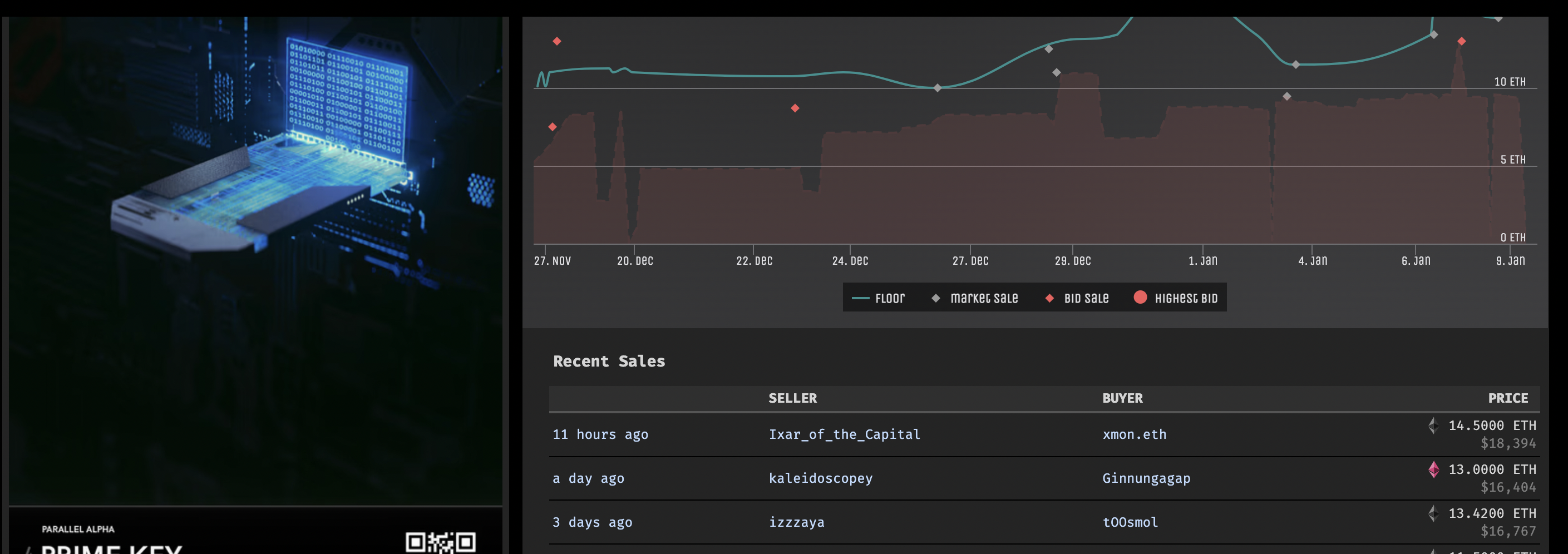 而遊戲的主要 NFT 資產 Prime Key 在近期的成交價大約為 13.5 ETH (當前價值 17500 美元)。